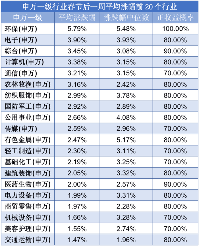 从过去10年春节后行业上涨情况看,春节后一周,有15个行业正收益概率超过了80%,环保行业在过去10年里每年节后一周都上涨,其次是综合、医药生物行业,过去10年中有9年上涨,正收益概率达90%。