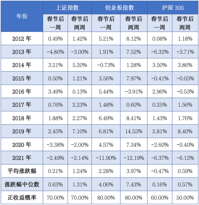 (来源:wind,2012年至2021年,平均涨跌幅是对上证指数、创业板指数、沪深300指数的区间涨跌幅数据求平均,公式为平均涨跌幅=样本内指数涨跌幅的和/区间样本个数,正收益概率=样本内指数涨幅数量/区间样本个数)