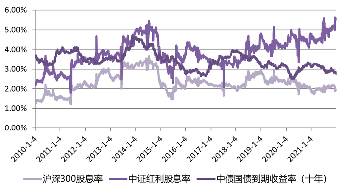 下图为中证红利指数的历史股息率,由图可知红利指数的股息率常年高于沪深300指数,自2019年以来更是大幅超过国债利率,长期持有高分红的股票可获得较稳定的分红。