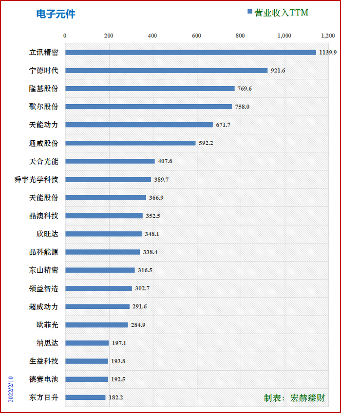 营收TOP3为:立讯精密1140亿、宁德时代922亿、隆基股份770亿