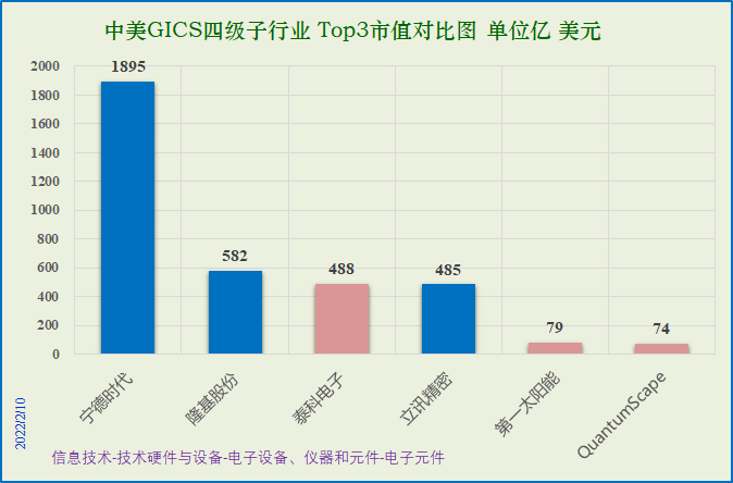 中股市值前三:宁德时代1895亿,隆基股份582亿,立讯精密485亿美元。
