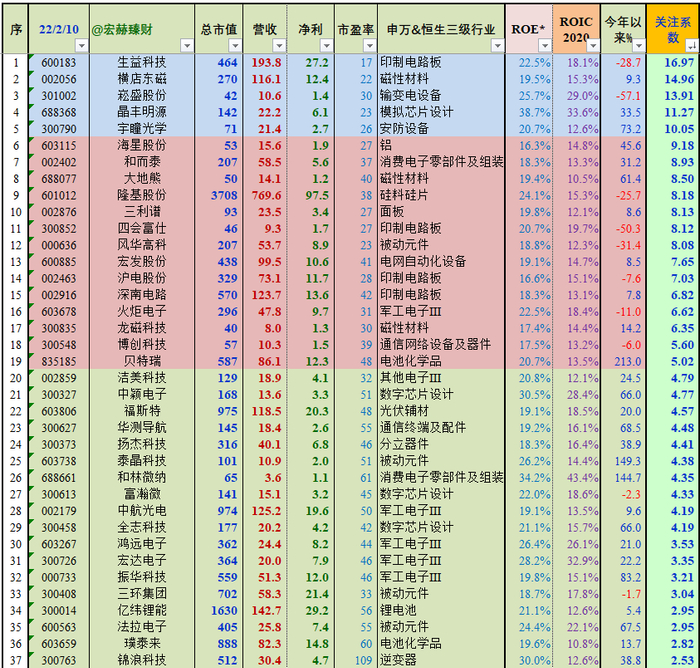 说明:排序按照宏赫臻财原创之关注系数排名,建议优先研究系数为5以上的个股,但此系数不构成投资建议。且不一定是越大越好。整体上看,5分以下居多说明该细分行业整体偏高估,资本市场喜欢给予溢价,5分以上居多,说明该细分行业整体偏低估,资本市场往往给予溢价性不强。(建议优先关注次序:①5-10分;②2.5-5分;③10-20分;④其他,回避两头极端值)