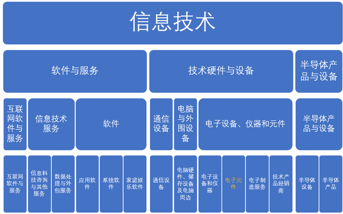 从上至下依次为:行业部门、行业组、行业和子行业。