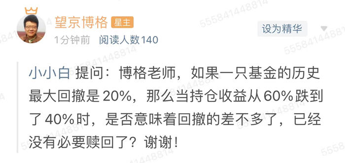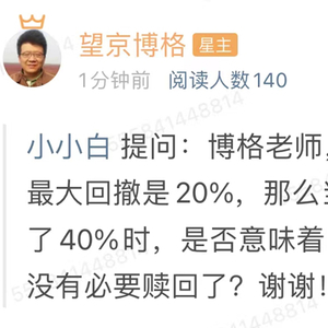 a基金的历史最大回撤是20%,老王的持仓收益从60%到40%,也就是该基金的净值,从1.0涨到1.6,再从1.6跌到1.4的过程。