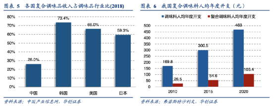 但纵观国际市场,餐饮企业品牌化、连锁化是大趋势,近年来在不同品类和赛道中,都能看到新诞生的连锁品牌快速扩张占领市场,伴随而来的将是复合调味品渗透率的快速提升。根据 Frost&Sullivan统计,近年来我国 复合调味料的渗透率已由2015年的18.20%,提升至2018年的25.97%,但相较日韩美等国家超50%的水平仍有较大差距,其中 2018年美国复合调味料渗透率高达 73%。从人均复合调味料的支出角度来看,2016年我国人均复合调味料的支出约为9美元,相较于美国(85.5 美元)及日本(88.7 美元)均有较大的提升空间。