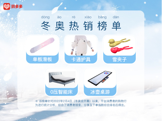 近日,冬奥盛会引发全民关注,滑雪等运动的关注度显著增加,激发了人们对于冰雪运动的参与热情。健儿们在赛场上拼搏,网友则在网上拼购起了滑雪装备。2月16日,新电商平台拼多多发布冬奥热销榜单,自冬奥会开幕以来,单板滑雪板、滑雪护具、0压智能床、冰壶桌游等商品销量涨幅明显。同时冬奥“顶流”IP效应明显,谷爱凌同款、冰墩墩成为热门搜索词。