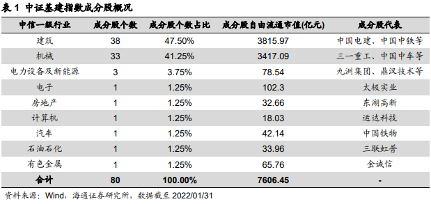 从中证基建指数成分股的市值分布情况来看,截至2022年1月31日,中证基建指数成分股市值主要集中在100亿元以上公司(占比合计64.20%),具有较好的市值容量。其中,市值在300亿元以上的仅有4家,但权重占比达到了34.21%;市值在100-300亿元共9家,权重占比为29.99%;50-100亿元的共19家,权重占比为18.34%;30-50亿元的共21家,权重占比为11.31%;30亿元以下的共27家,但权重仅有6.15%。指数成分股自由流通市值平均值为95.08亿元,中位数为44.49亿元,显示虽然指数成分股权重集中在高市值个股,但成分股中低市值个股同样较多。