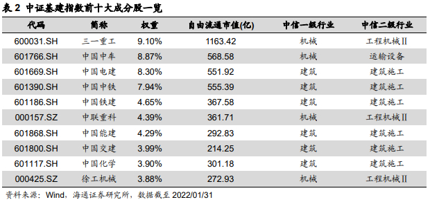 中证基建指数成分股集中度较高,重仓股总市值较大。截至2022年1月31日,中证基建指数前五大成分股权重占比合计38.85%,前十大成分股权重占比合计59.50%,个股集中度较高。此外,前十大成分股平均自由流通市值为464.98亿元,所有成分股中自由流通市值最高的三一重工自由流通市值为1163.42亿元.