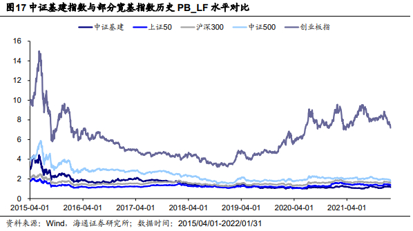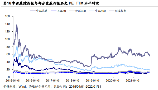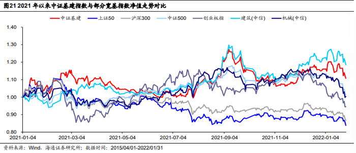 我们以中证基建指数的发布日2015年3月31日作为基准日,将中证基建指数与市场代表宽基指数上证50、沪深300、中证500、创业板指,及中信建筑行业和中信机械行业的走势进行对比。截至2022年1月31日,中证基建指数的累计收益率为-33.53%,仅高于中信建筑行业指数的累计收益率,低于其他指数,整体来看收益表现弱于大盘。