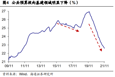 2021年基建投资较弱主要与资金偏紧有关,由于2020年经济回升较好,2021年政策整体偏向结构调整、淡化总量刺激。因而,基建投资的资金来源整体偏紧,导致基建投资持续疲弱。主要体现在以下几个方面:公共预算投资基建领域的比例明显下降;专项债发行偏晚、发行偏慢、投向基建比重下滑;以及隐性负债监管趋严、非标融资继续压降以及房地产政策持续趋严等等。