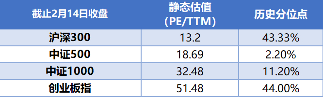 可以看到,截至2月14日,上证综指、中证500、中证1000的市盈率(PE)分别为:13.21倍,18.69倍,32.48倍,其中上证综指、中证500的市盈率(PE)处于历次“3400点时刻”中最低的位置。