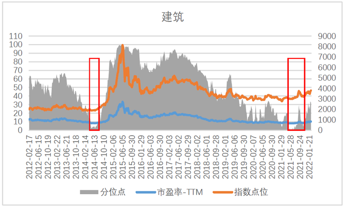 而在2021年2季度第二轮估值下行中,市盈率分位点最低至0,建筑行业指数并未看到明显上涨。