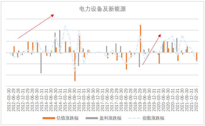 电力设备及新能源行业的在这两段时期的强势反弹是估值修复叠加盈利修复的结果。