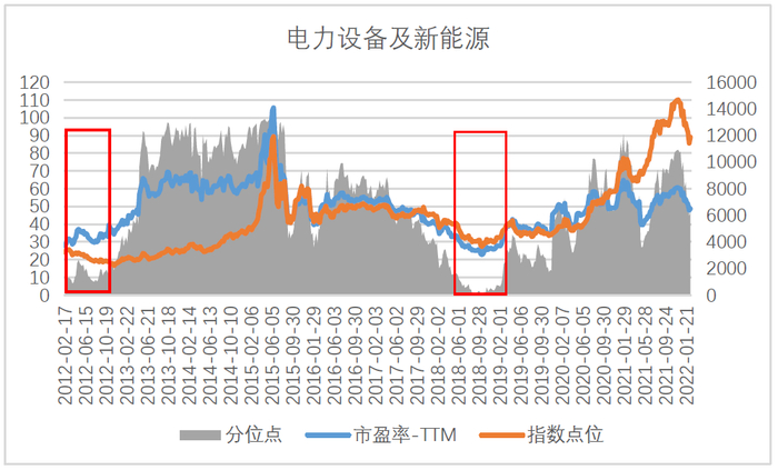 热门赛道我们以电力设备及新能源为例,2012年以及2018年的估值下行,市盈率分位点均下降至了10%以下水平,在此之后,均可看到该行业指数在之后三年期间持续上涨。