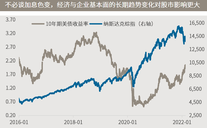 今年陆续公布的零售销售、通胀、就业等数据均相当强劲,美联储明显转向鹰派也在情理之中,而市场也逐渐在对数据和政策信号进行定价和消化,例如尽管美债收益率进一步冲击2%的长期压力位,但美股的底部却在波动中抬升,哪怕乌克兰事件是本月才发酵的。在此背景下,投资者一方面应继续密切关注美国经济数据和联储官员言论,但更重要的或许是关注这些经济数据的边际变化方向,二季度面临的高基数意味着边际向上的概率其实并不高,而美联储已经表态将基于届时的数据做决策。始终牢记,资本市场通常是提前反映未来的。