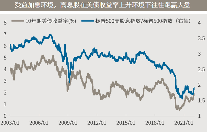从历史表现来看,红利指数在10年期美债收益率上升的环境下往往跑赢大盘。背后原因在于高息股本身估值并不高,在加息背景下杀估值的压力较小,同时由于它们与经济周期的联系更为紧密,反而可能受益于经济的增长和通胀的上升,从而在盈利增长层面对股价构成资金。此外,资金从成长股向低估值、高息股的切换,也会推动红利指数的上涨。在今年美国加息的大环境下,内地投资者相对容易接触、且更容易受美债收益率影响的港股通低波红利指数值得重点关注。