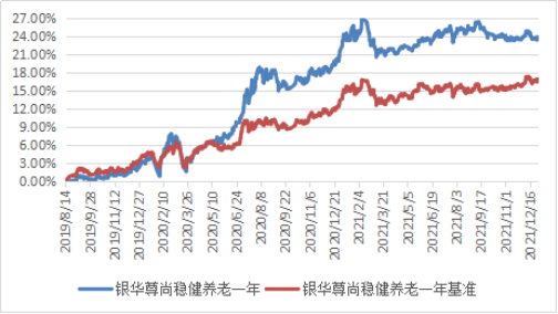 据基金定期报告数据显示,自2019年8月14日成立以来至2021年12月31日,银华尊尚收益率达23.89%,同期业绩比较基准为17.13%,超额收益明显。采用“固收+”策略的银华尊尚稳健养老一年FOF长期业绩不俗。
