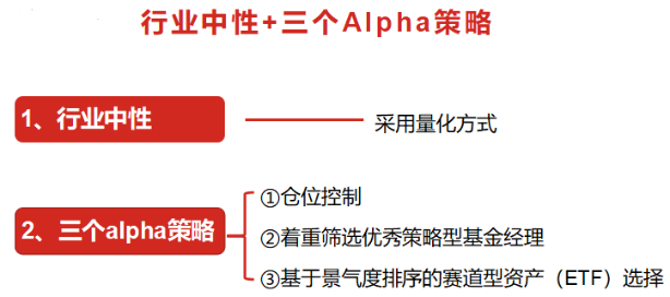 在股基选择方面,银华尊禧将坚持“行业中性+三个Alpha策略”。所谓行业中性,就是通过量化方法测算出基金指数中各板块(行业)类别和比例。三个Alpha策略则包括:①仓位控制;②筛选绩优基金经理,着重爬坑能力的“策略型基金经理历史业绩评价体系”;③基于景气度的赛道型资产(ETF)选择。