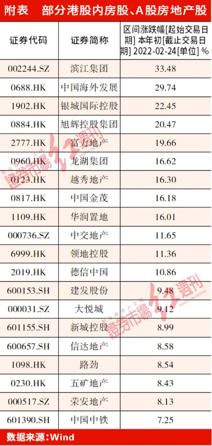 今年以来,以滨江集团、中国海外发展等为首的港股内地地产股以及A股地产股股价持续走高。Wind数据显示,截至2月24日,滨江集团股价累计上涨33.48%,中国海外发展涨幅29.74%,旭辉控股集团涨幅20.45%。此外,富力地产、龙湖集团、越秀地产、中国金茂、华润置地等规模房企涨幅均在15%以上。