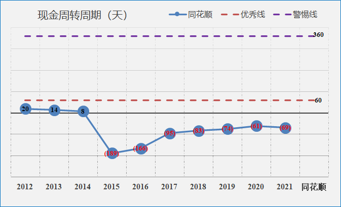 优先关注该指标小于60的企业;如果该指标为负数则更优,表示企业的还款周期远大于存货变现期;警惕该指标大于360的企业。