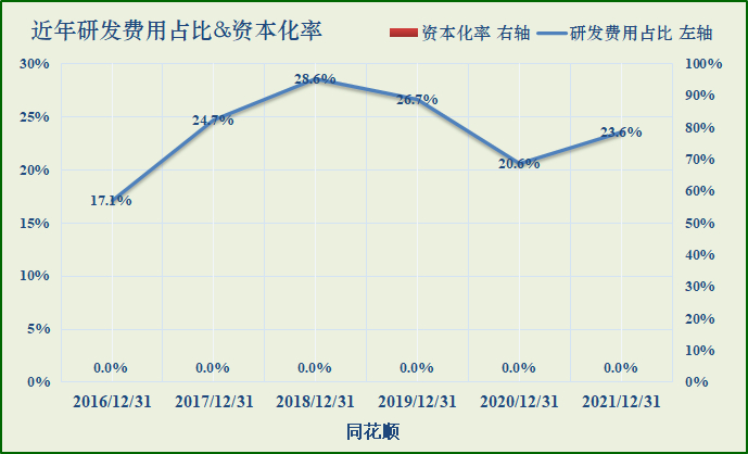 同花顺2021年末研发费用:8.3亿,占营收比:23.6%,资本化率:0.0%。投入研发占营收同比2020有提升,整体近年来保持高研发投入。研发费用在同行业占比见文首表格。