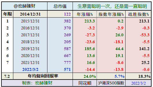 整年度评测:7个整年度段里3年市值增长战胜指数,胜率【43%】,今年以来暂时落后指数。期初至今7.2年的光阴里市值从122亿增加至571亿,实现年均复利回报率24.0%,同期沪港深500指数年均增长5.7%。
