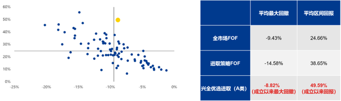 基金经理林国怀代表产品兴全优选进取FOF(自2020年12月起,与基金经理丁凯琳共同管理)自2020年3月6日成立以来实现回报49.59%,居同期全市场FOF前2(2/88,银河分类),同期最大回撤仅8.82%,较同期全市场进取策略FOF(权益仓位50%-80%)的平均最大回撤14.58%大幅降低,在争取超额收益的同时,较好地控制了波动水平。