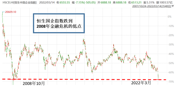 恒生国企指数在2022年3月14日收盘价也非常特别6555.55,如果你把恒生国企指数的历史数据拉出来,你会惊讶的发现恒生国企已经跌到2008年那次金融危机时候的底部了。