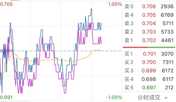 我们随便选了一只境内ETF产品,有两条线,蓝线是ETF的成交价走势,反映了ETF场内的实时价格,而紫线是ETF实时单位净值的近似值,也称作ETF的IOPV值。