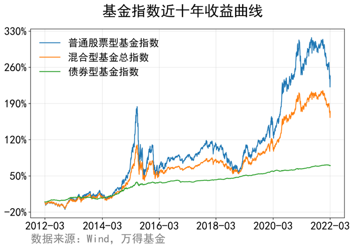 近10年(2012年3月19日至2022年3月18日),尽管期间偏股型基金指数经历大幅波动,普通股票型基金指数期间(日度)年化波动为23.17%,混合型基金总指数为15.54%,债券型基金指数为2.35%。但从累计收益看,普通股票型基金指数上涨了243%,混合型基金总指数上了175%,债券型基金指数上了70%。