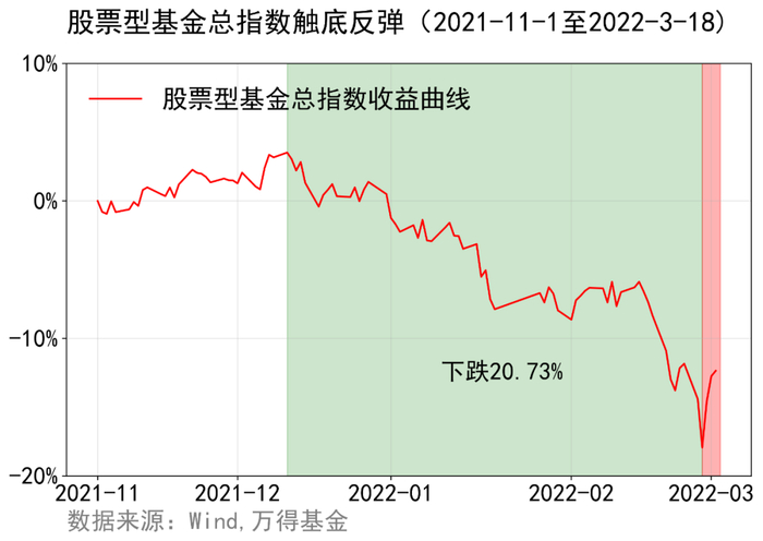 Wind数据显示,2021年12月14日至2022年3月15日,股票型基金总指数在3个月时间下跌了20.73%,随后连升三日,3月16日至3月18日反弹6.81%。