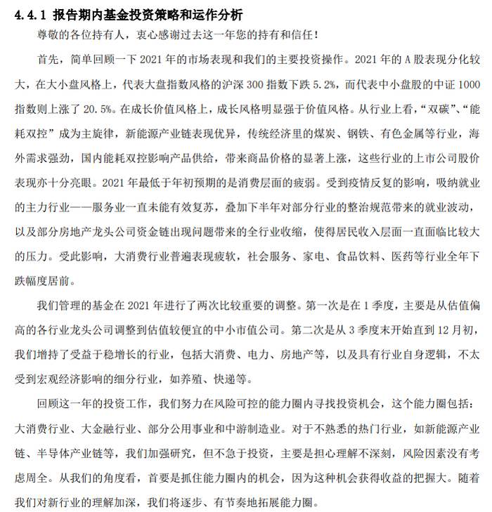 年报里的这两部分,一般是基金经理对过去一年的投资回顾以及立足当前时点对行业的一些见解看法,是基金经理的“小作文”时间,也是我们了解基金经理对未来行情走势看法的第一手材料。比如工银新蓝筹股票的这部分表述,基本就把基金经理对未来的看法及投资方向思路写了下来。