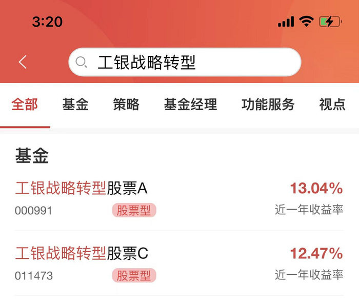 先来打开工银瑞信基金APP,然后在搜索框中输入“工银战略转型”,就会自动跳出这只基金。