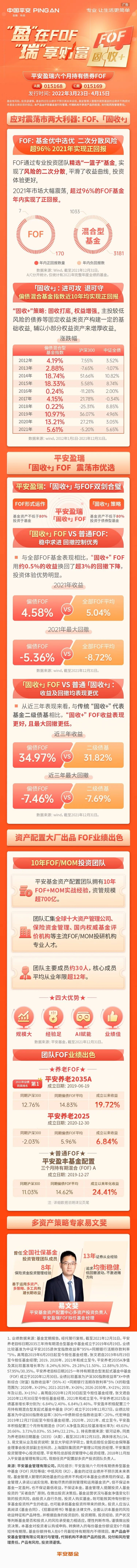 风险提示:平安盈瑞六个月持有期债券型基金中基金(FOF)风险等级:中低风险(R2)。基金的过往业绩并不预示其未来表现,基金管理人管理的其他基金的业绩并不构成对本基金业绩表现的保证。基金管理人承诺以诚实信用、勤勉尽责的原则管理和运用基金资产,但不保证本基金一定盈利,也不保证最低收益,不保证本金。基金管理人提醒投资人基金投资的“买者自负”原则,在做出投资决策后,基金运营状况与基金净值变化引致的投资风险,由投资人自行负担。投资人购买基金,既可能按其持有份额分享基金投资所产生的收益,也可能承担基金投资所带来的损失。投资人应当认真阅读《基金合同》、《招募说明书》等基金法律文件,全面认识本基金的风险收益特征和产品特性,并根据自身的投资目的、投资期限、投资经验、资产状况等判断基金是否和投资人的风险承受能力相适应,理性判断市场,谨慎做出投资决策。本基金对投资者认购或申购、转换转入的每份基金份额设定6个月最短持有期限,基金份额持有人在6个月最短持有期限内不得赎回。本产品由平安基金管理有限公司发行与管理,代销机构不承担产品的投资、兑付和风险管理责任。产品有风险,投资须谨慎。