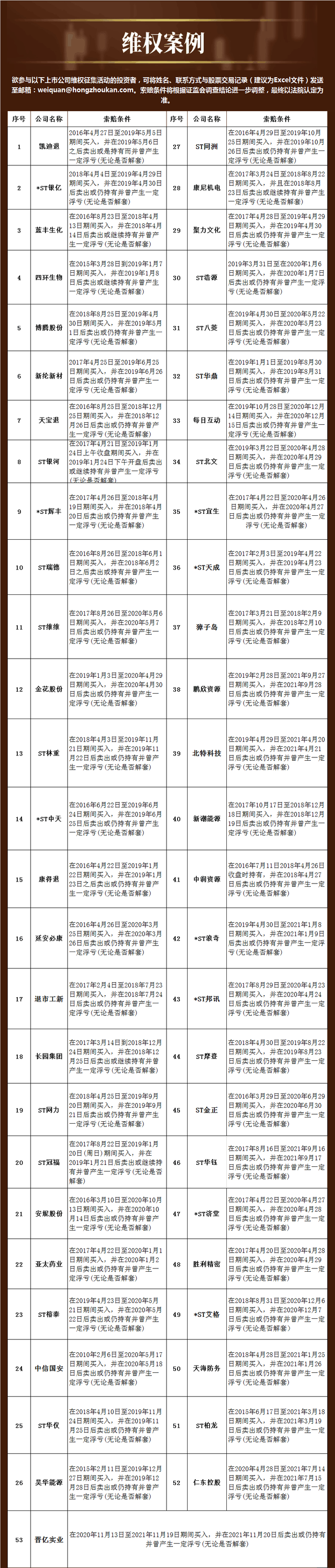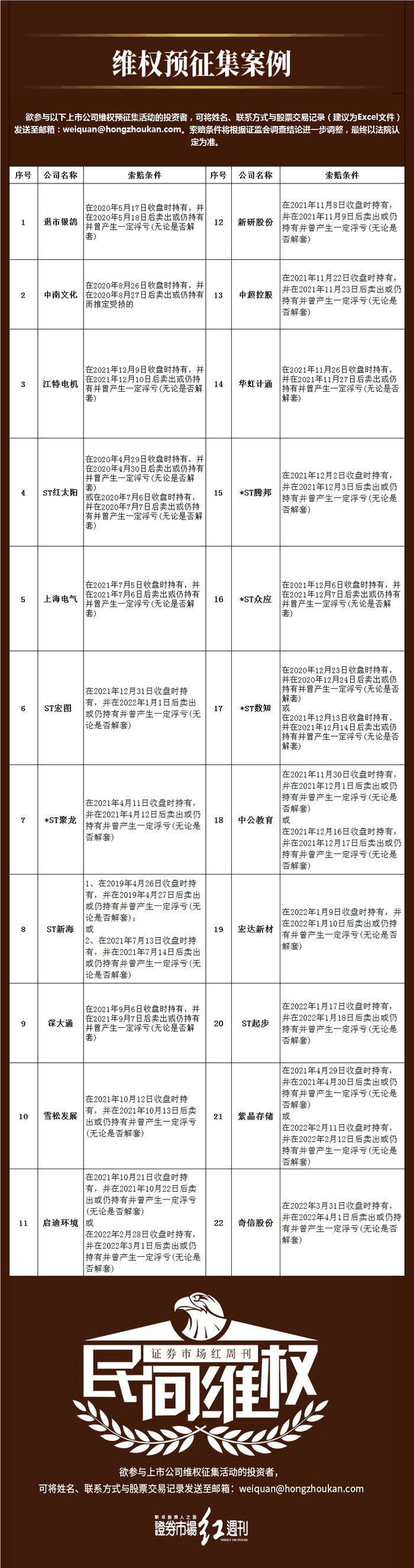 欲参与上市公司维权征集活动的投资者,可将姓名、联系方式与维权个股交易记录发送至邮箱: