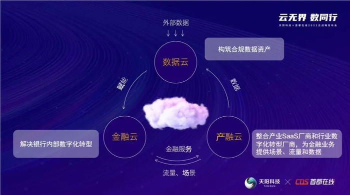 基于不同的定位和职能,天阳云分为金融云、产融云和数据云三个部分,“三朵云”相互关联和协同,目标是加速银行实现内部和外部的数字化转型,同时也提升天阳科技自身的创新力与产品能力,并且赋能合作伙伴。