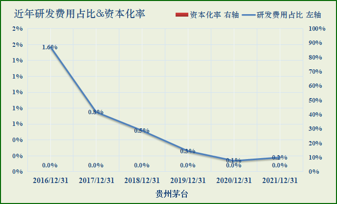 贵州茅台2021年末研发费用:1.9亿,占营收比:0.2%,资本化率:0.0%。