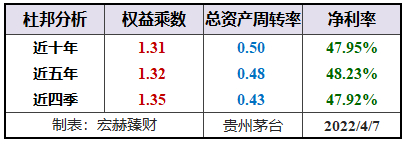 贵州茅台:适度杠杆+高净利率+中周转率。