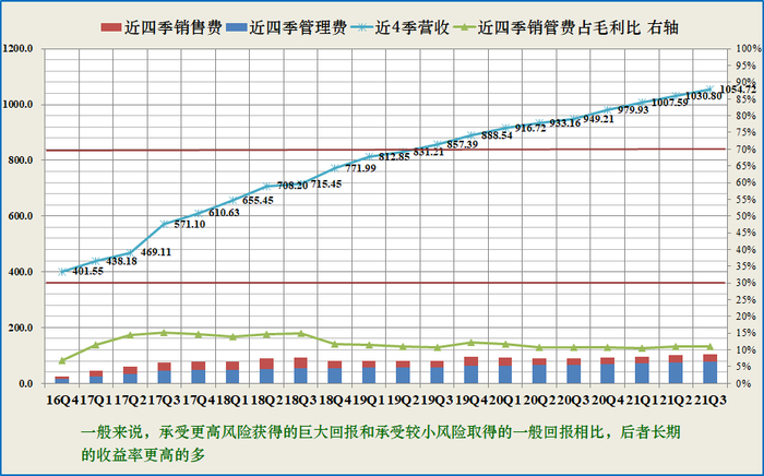 可关注近四季销售和管理费用与毛利润之比持续小于30%的公司,这样的具备较高的竞争优势(即图中绿线低于下红线为优异,靠近为优秀);若该指标处于30-70%之间(图中红色直线之间)为可接受区域;若大于70%需要警惕,说明该公司产生净利润的能力较弱。