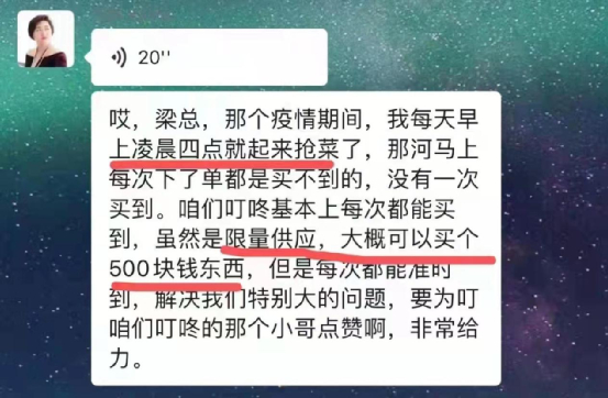 第三层,徐新每天4点开始抢菜,公开渠道也没有听到抱怨,一位身在上海的投资人朋友说,“我每天6点才起来抢,抢不到就哇哇叫,人顶级投资人4点就起来抢了,这就是差距”,至少说明叮咚、盒马等并没有为股东等人士开启特殊通道,套用一个时髦的词,挺ESG的正能量。