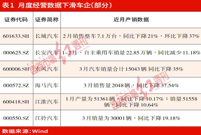 与长城汽车类似,江淮汽车等车企公布的近期月度销售数据均出现一定下滑(见表1)。
