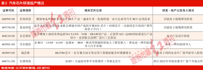 《红周刊》获悉,一些本土企业的汽车芯片目前多处于产品研发、认证以及客户导入阶段,并未实现大规模的量产。如纳思达表示,2022年上半年预计有数款32位MCU芯片产品将进行车规AEC-Q100认证,对于何时实现批量供应,《红周刊》以普通投资人身份致电纳思达,对方相关人员并未给出明确时间;另外,泰晶科技、东芯股份等也均表示在增加车规芯片的布局,但目前尚处于前期研发阶段,量产时间并未确定;韦尔股份相关的汽车芯片需要一到两年才会导入汽车市场(见表2)。