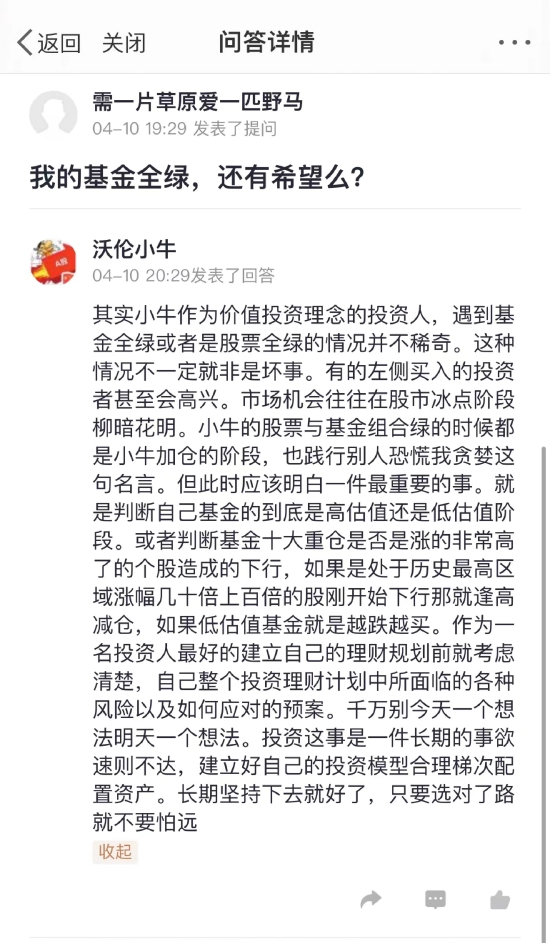 其实小牛作为价值投资理念的投资人,遇到基金全绿或者是股票全绿的情况并不稀奇。这种情况不一定就非是坏事。有的左侧买入的投资者甚至会高兴。市场机会往往在股市冰点阶段柳暗花明。小牛的股票与基金组合绿的时候都是小牛加仓的阶段,也践行别人恐慌我贪婪这句名言。但此时应该明白一件最重要的事。就是判断自己基金的到底是高估值还是低估值阶段。或者判断基金十大重仓是否是涨的非常高了的个股造成的下行,如果是处于历史最高区域涨幅几十倍上百倍的股刚开始下行那就逢高减仓,如果低估值基金就是越跌越买。作为一名投资人最好的建立自己的理财规划前就考虑清楚,自己整个投资理财计划中所面临的各种风险以及如何应对的预案。千万别今天一个想法明天一个想法。投资这事是一件长期的事欲速则不达,建立好自己的投资模型合理梯次配置资产。长期坚持下去就好了,只要选对了路就不要怕远。