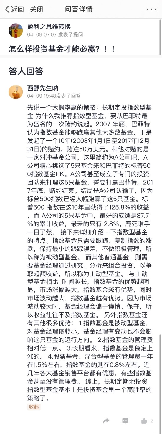 综上,长期定期地投资指数型基金基本上是投资基金里一个高胜率的策略了。