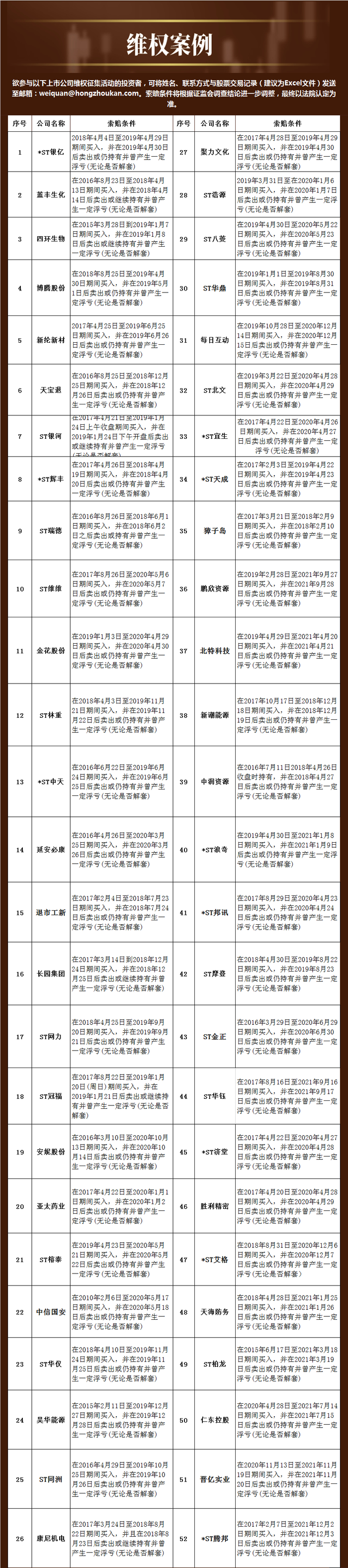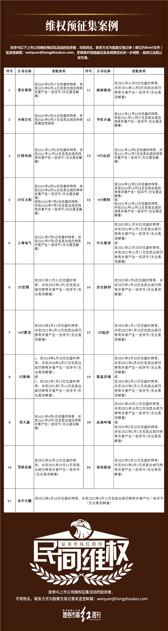 欲参与上市公司维权征集活动的投资者,可将姓名、联系方式与维权个股交易记录发送至邮箱:
