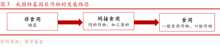 我国转基因农作物采用“非食用-间接食用-食用”的发展路径,首先发展非食用的经济作物,其次是饲料作物、加工原料作物,再次是一般食用作物,最后是口粮作物。