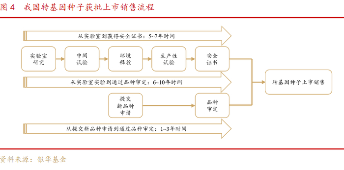 我国对于转基因植物和动物有着严格,细致且条目众多的评价标准。从政策细则来看,制种企业需要同时获得安全证书及品种审定才能开始进行转基因种子制种。安全证书获批的时间周期非常冗长,企业需要经历五大阶段,且耗时最短至少五年才能获得。取得安全证书后,企业需要进入下一个阶段:品种审定。品种审定流程依据不同的条件需要的审定时间各不相同。已获得安全证书且受体品种位于适宜种植区域范围内的企业,只需要一年的生产试验审定期。一旦通过品种审定,企业将获得转基因种子上市销售的资格,也能够随即投入到制种阶段。