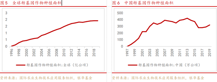 我国从1998年开始种植转基因作物,当时主要是抗虫棉的推广,1998-2007年9年间,中国转基因作物的种植面积由30万公顷增长至390万公顷,9年CAGR达到32.98%,之后转基因作物种植面积较为稳定,2019年为320万公顷。