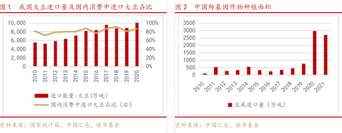 数据显示,我国为大豆进口大国,大豆进口量从2010年的5480万吨上升至2020年的超过一亿吨,并且进口大豆量占国内大豆消费量常年大于80%,2020年这一比例达到86.55%;近年来,我国玉米进口量也大幅上升。据了解,2019年、2020年,农业农村部相继批准了7个转基因耐除草剂大豆和转基因抗虫耐除草剂玉米的安全证书,其商业化应用有望缓解国内粮食供需紧张格局。