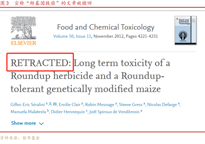 2012年12月,法国里昂大学教授塞拉利尼发布于《食品化学毒物学》杂志的一项研究称,用转基因玉米NK603喂养的实验鼠换上了肿瘤,通过转基因技术,这种玉米对草甘膦除草剂“Roundup”具有抗药性,因此种植这种转基因玉米的农民可以放心使用“Roundup”,既不会对作物造成影响,又能节省费用。但凯恩大学研究团队发现,用NK603和被“Roundup”污染的饲料喂养的实验鼠,罹患肿瘤和其他内脏损伤比例非常高。